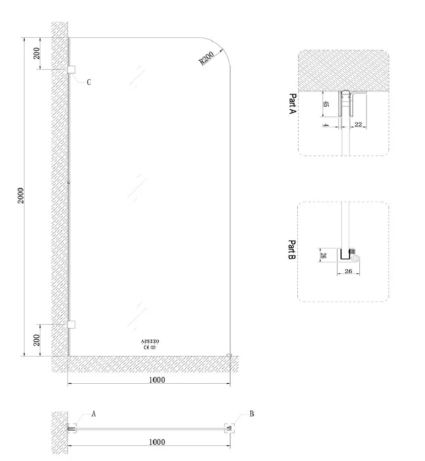 AREZZO design CLEAR walk-in zuhanyfal, átlátszó 1000x2000